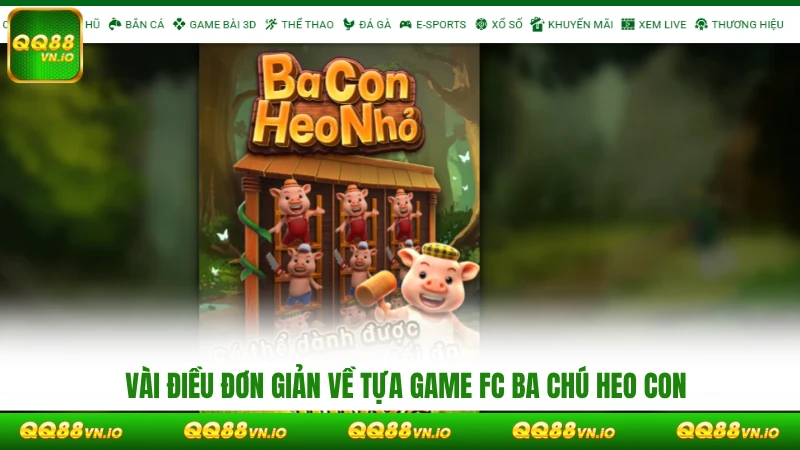 FC Ba Chú Heo Con là một trò chơi slot được thiết kế theo phong cách hoạt hình đáng yêu dựa theo câu chuyện cổ tích cùng tên. Game được thiết kế theo dạng 5 cuộn, 3 hàng dọc, với nhiều biểu tượng đặc trưng như chú heo, ngô, nhà gỗ, rơm và các thùng nước,… Mỗi biểu tượng sẽ có điểm thưởng khác nhau từ 5 đến 300 điểm tùy tổ hợp.