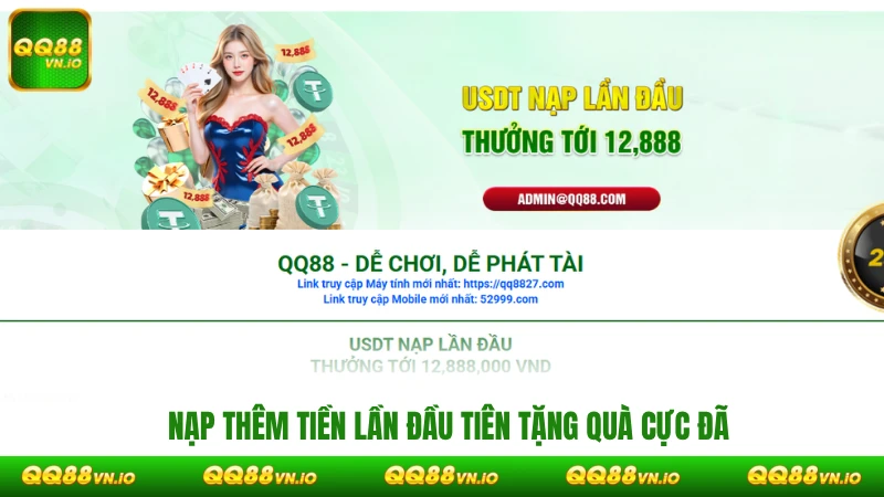 Dành sự ưu đãi đặc biệt cho tân binh với chương trình khuyến mãi QQ88 nạp đầu siêu giá trị, lên đến 8.888.000 VNĐ. Chỉ cần bạn mở tài khoản thành công và hoàn tất xác minh ngân hàng, khi nạp tiền lần đầu từ 100k trở lên, bạn sẽ được tặng thưởng ngay theo cấp bậc tương ứng. Từ mốc giá trị nhỏ như 68k đến cao nhất là 8.888k, số tiền nhận được sẽ tăng theo số tiền nạp.